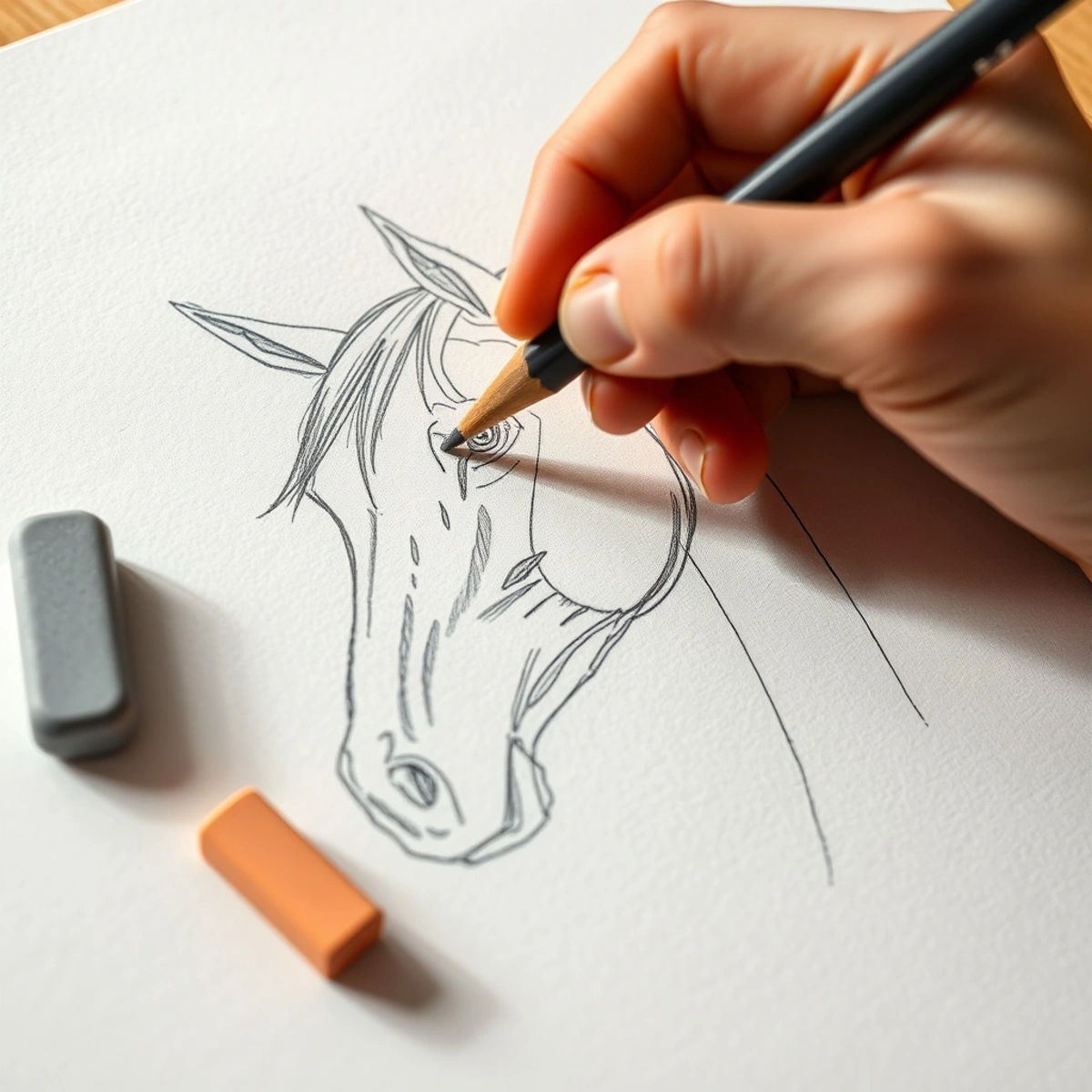 Начните с легкого наброска. Возьмите карандаш и нарисуйте большой овал для грудной клетки и меньший, вытянутый овал для крупа. Соедините их плавной линией, обозначающей спину и живот. Не давите на карандаш, эти линии — лишь помощники, которые позже можно будет стереть. Такой подход — ключ к тому, как правильно рисовать лошадь, сохраняя правильные пропорции.