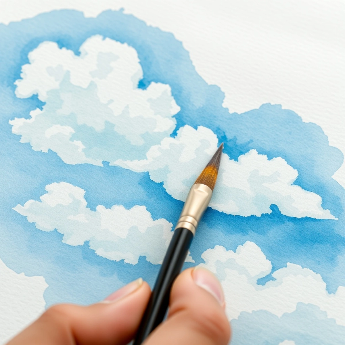 Техника рисования облаков сильно зависит от материалов. Для нежных, размытых переходов идеально подходит акварель. Как рисовать облака акварелью для начинающих? Секрет в сырой бумаге. Смочите участок неба чистой водой и введите разбавленную краску, позволяя ей растекаться и создавать мягкие границы. Белые области — это не белая краска, а чистая бумага, которую нужно бережно обходить.